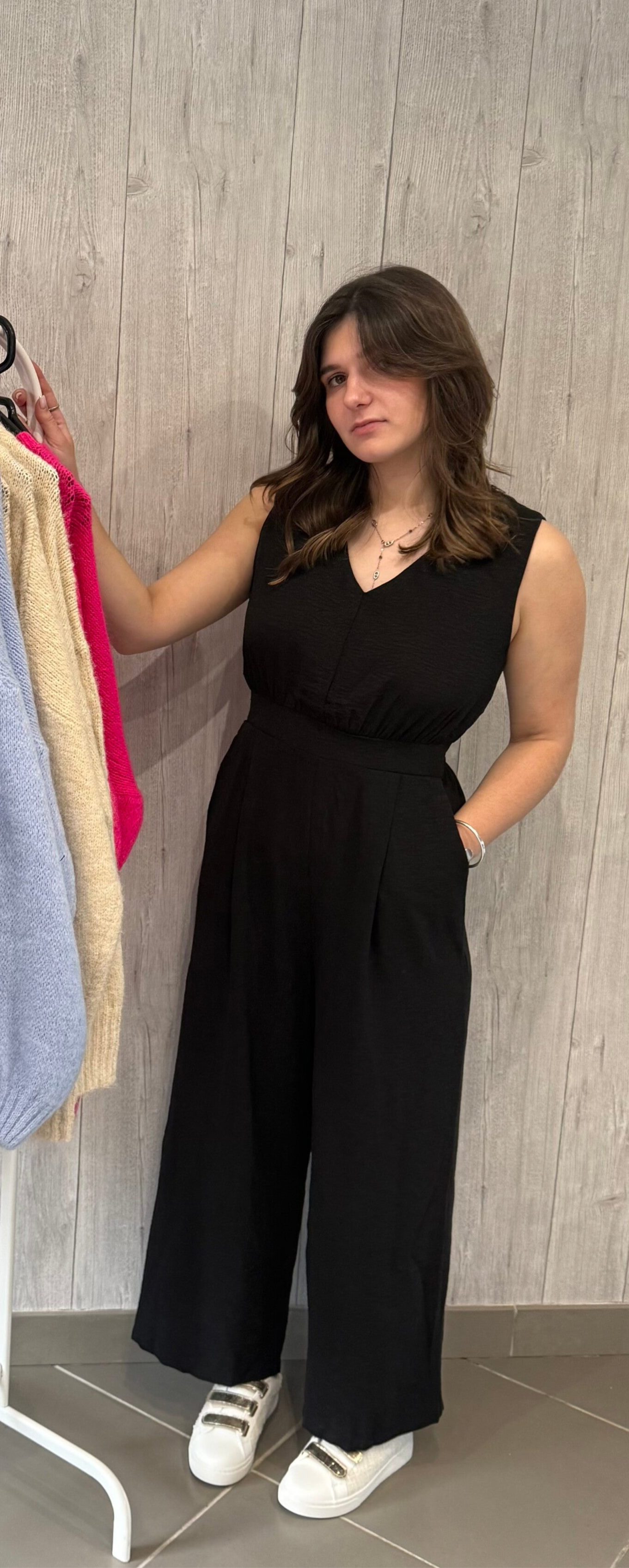 Combinaison noire élégante avec dos ouvert orné de dentelle pour une touche féminine et sophistiquée. Cintrée à la taille, elle met en valeur la silhouette, tandis que le pantalon fluide assure confort et élégance. Le décolleté en V apporte une note chic et sensuelle, parfaite pour un look raffiné.