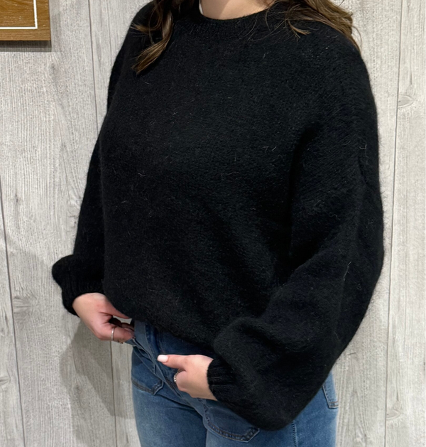 Pull noir à col rond, confectionné en laine mohair de haute qualité, offrant une chaleur douce et confortable. Resseré au niveau de la taille et des manches, il assure une silhouette féminine et soignée. Pour préserver la qualité et la douceur du mohair, le lavage en machine est fortement déconseillé.