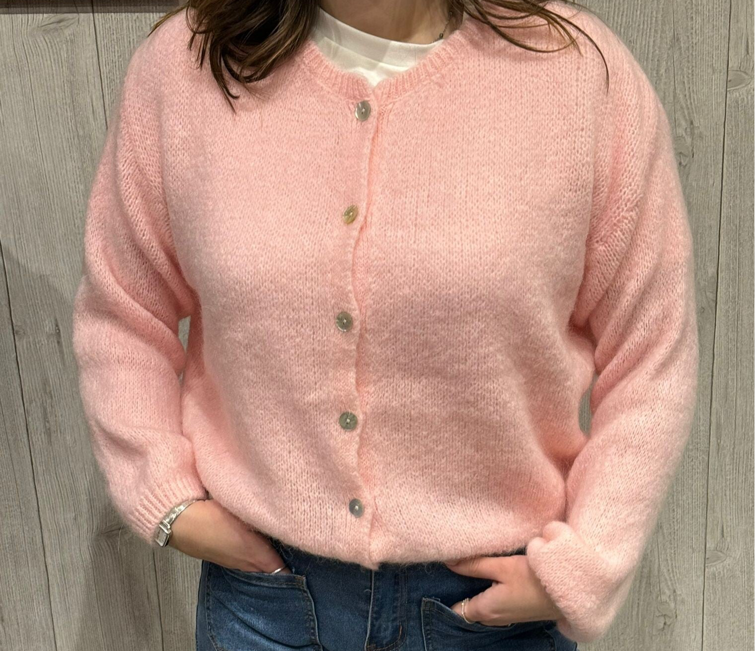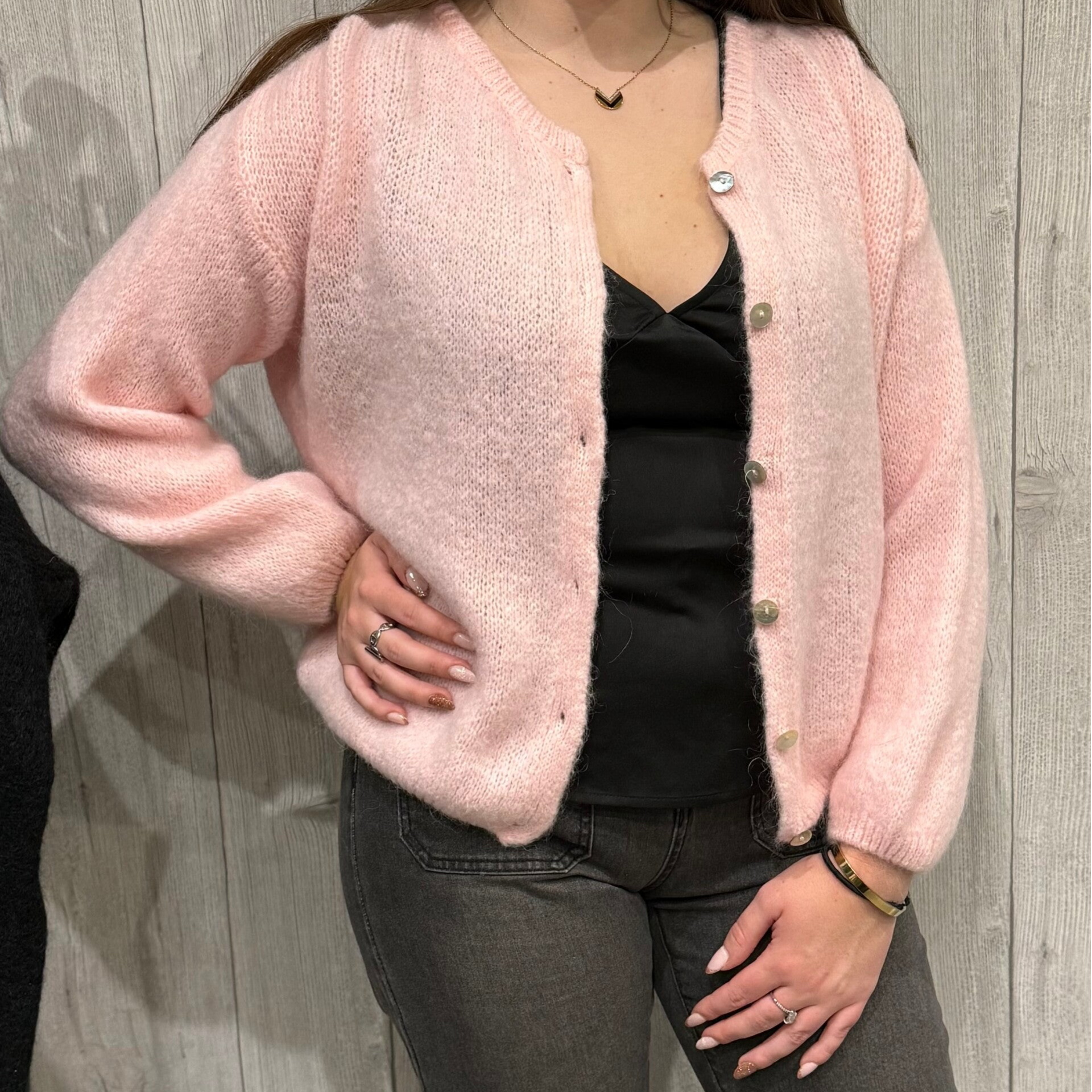 Gilet rose boutonné, confectionné en mohair de qualité, offrant chaleur et douceur au quotidien. Resseré à la taille et aux manches, il structure la silhouette avec élégance. Afin de préserver la matière, le lavage en machine est fortement déconseillé.
