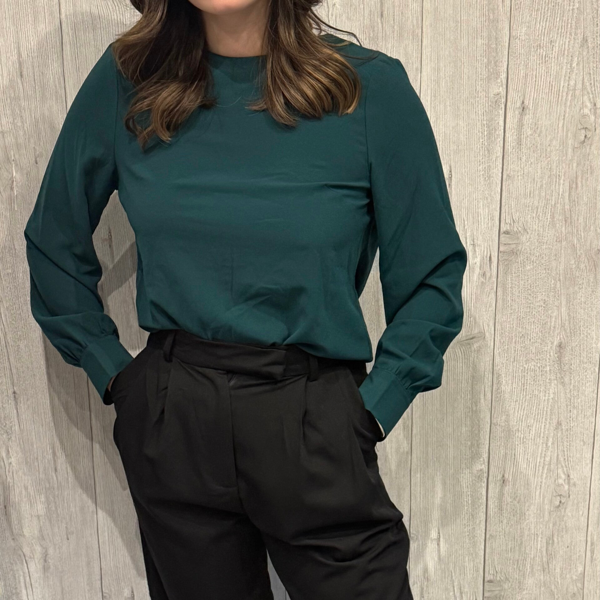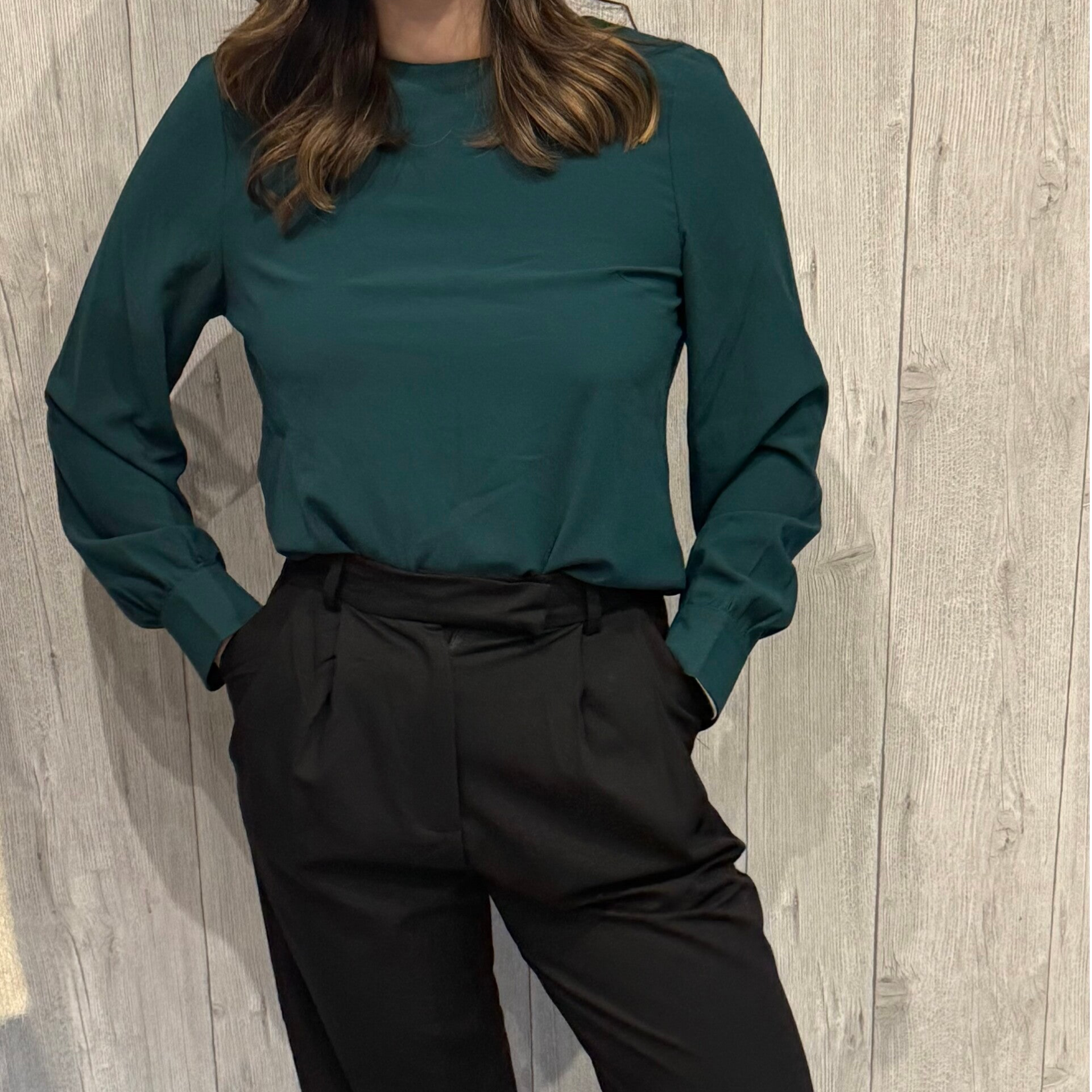 Blouse verte à manches longues, entièrement couverte à l’avant pour une allure sobre et élégante. Son décolleté plongeant dans le dos apporte une touche audacieuse et raffinée, créant un joli contraste entre discrétion et féminité. Une pièce chic et originale, idéale pour un look habillé