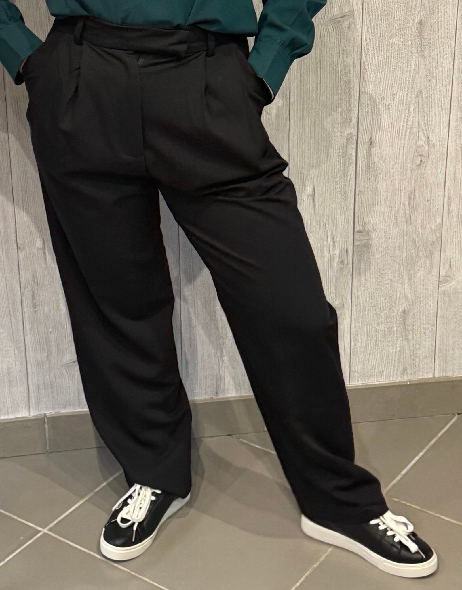 Pantalon noir cintré, doté d’un bouton de fermeture pour une finition soignée. Son bas large apporte une touche moderne et élégante, tout en équilibrant la silhouette. Une pièce chic et intemporelle, parfaite pour un look habillé.