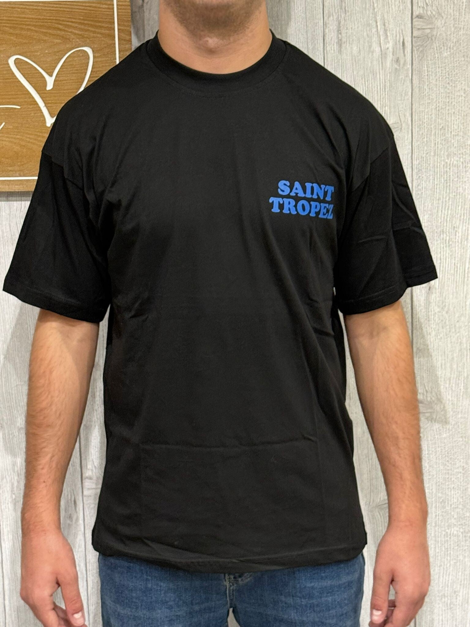 Au dos, un dessin bleu représentant la ville de Saint-Tropez apporte une touche graphique et estivale. Sur l’avant, le nom “Saint-Tropez” est inscrit en bleu, pour un rappel élégant et harmonieux. Un modèle au style affirmé, idéal pour un look décontracté et moderne.